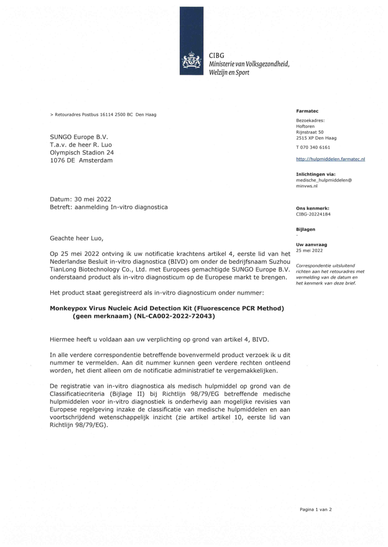目前,天隆猴痘病毒檢測試劑已取得歐盟CE及英國MHRA注冊,廣泛應用于國內多省、市疾控中心及海關檢驗等單位,守護國門安全和國民健康;同步為西班牙、沙特、韓國、約旦、印尼、希臘等10余個海外國家提供服務,在更廣范圍內書寫科技服務人類健康的新篇章,為全球公共衛生事件防控貢獻中國智慧和方案。