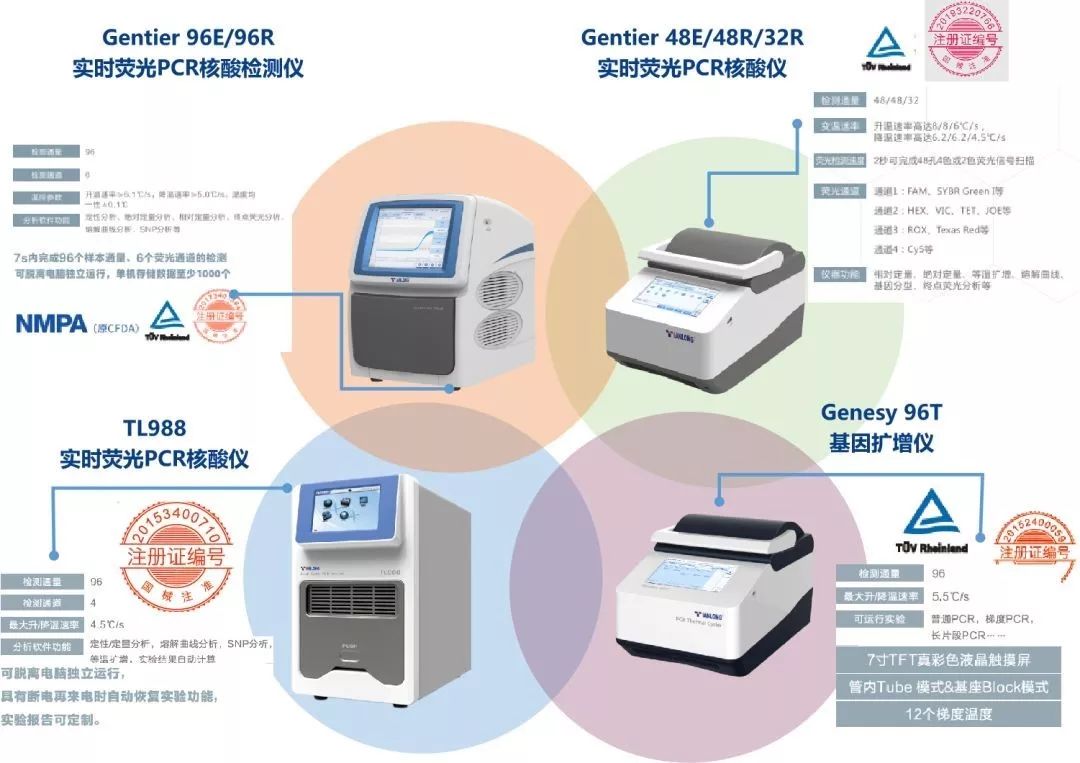 自疫情爆發后,天隆新型冠狀病毒核酸檢測試劑、實時熒光 PCR 儀、核酸提取儀、全自動核酸檢測工作站已裝備了全國數百家醫院和疾控中心,助力疫情防控,天隆產品現已獲得了50余個醫療器械注冊證、5個CE認證、2個CB認證,10個韓國FDA認證,5個國家重點新產品證書。試劑產品獲三類醫療器械注冊證26個(含應急審批的埃博拉病毒檢測試劑),其中傳染病類18個,獲證數量及市場占有率在國內排名前列。